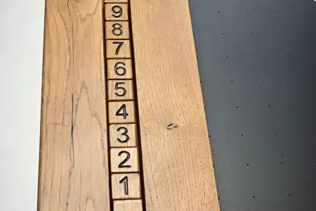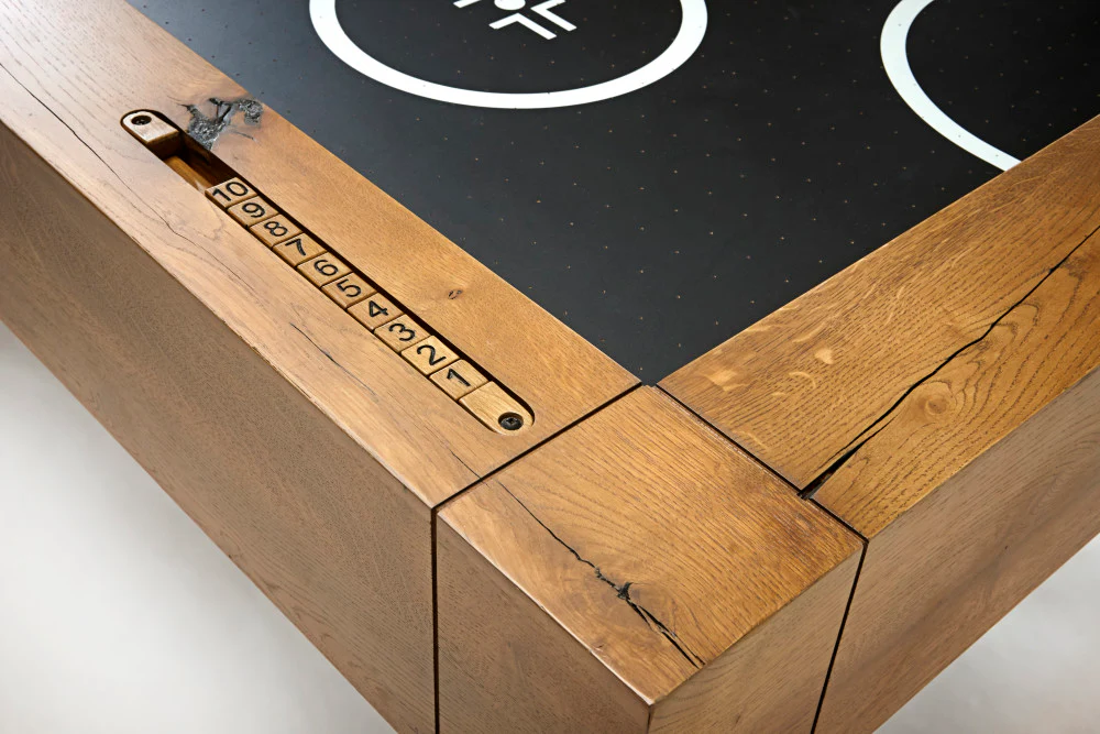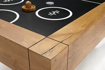 The Parsons Air Hockey Table showcases a sturdy, minimalist design with a natural dry oak finish, highlighting the exquisite hardwood knots and cracks that make each table truly one-of-a-kind.