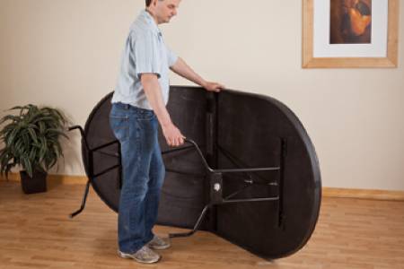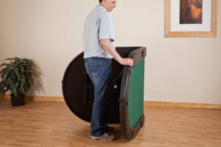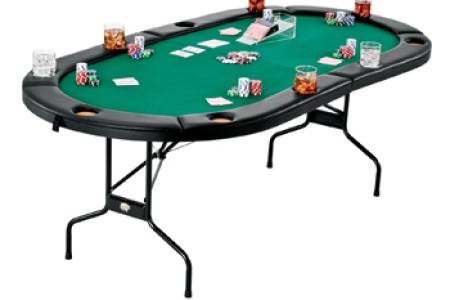 The green cloth playing surface is comfortable and level, and prevents chips and cards from unwanted shifting. The rail is cushioned for extra comfort, and also incorporates 10 built-in drink holders. The table's legs are collapsible, and the center of the table folds for easier storage. Overall, the table measures 83-1/2" long and provides plenty of surface area for any poker game.