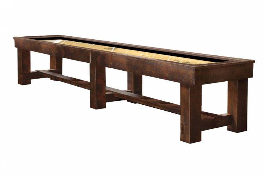 With its weathered, reclaimed wood characteristics, artistic finger joints, and antique bolt accents – this old-world-style shuffleboard table by Olhausen delivers the perfect time-worn memorial to the great artisans of the past.
