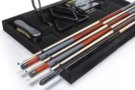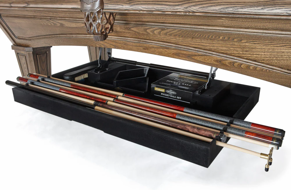 The Brunswick Billiards Storage Drawer is a convenient and practical accessory that can be attached to the underside of your Brunswick Billiards table, providing ample space for storing all the accessories, including cues stored at full length.