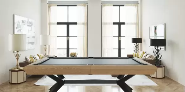 The Pierce is a modern pool table set off by bold stainless-steel legs and comes in a natural walnut finish.