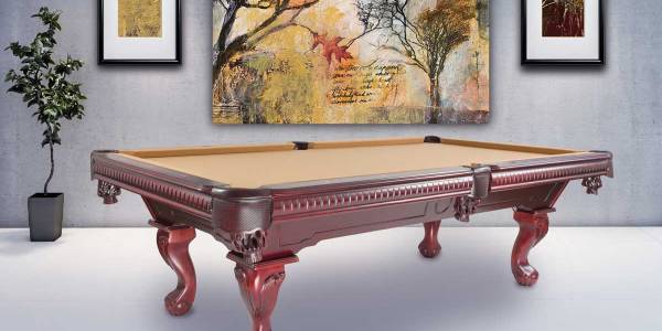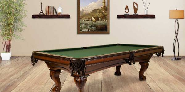 The Monroe is a classic billiard table crafted from African hardwood. It has a distressed Walnut finish with dark highlights. The two-tone finish on the Monroe hardwood billiard table accentuates the detailed ball and claw pool table leg carving.