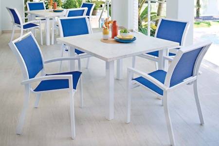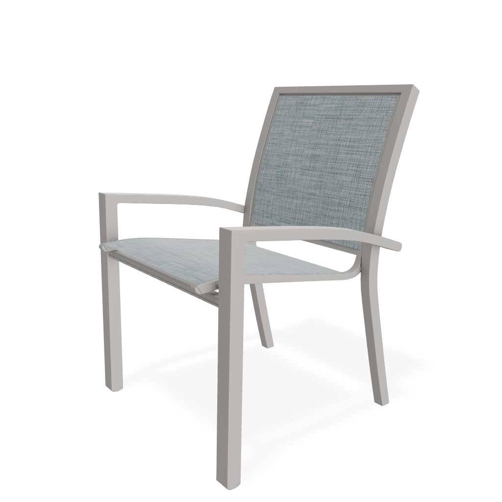 The chair's sleek design features include a fully enclosed back and crisp lines that give it a more contemporary look. The items are constructed of tubular aluminum and are built for years of enjoyment.