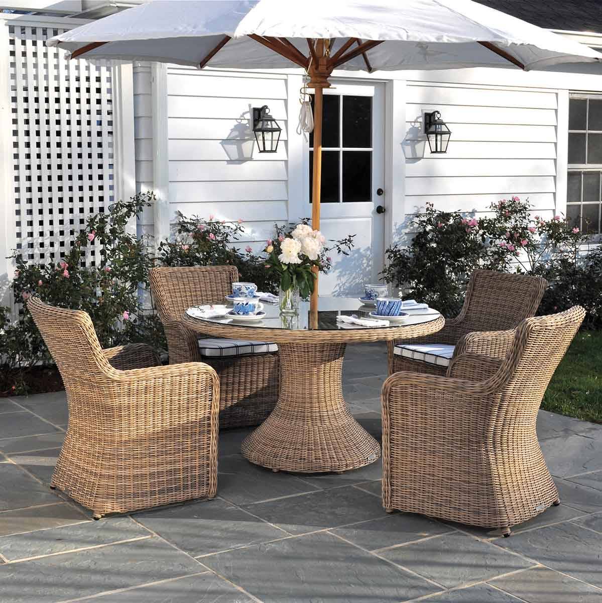 The Sag Harbor dining pieces are hand-woven in a premium extra-large fiber, making for heavier and more substantial seating than standard outdoor wicker chairs. Coordinating deep-seating pieces complete the experience.