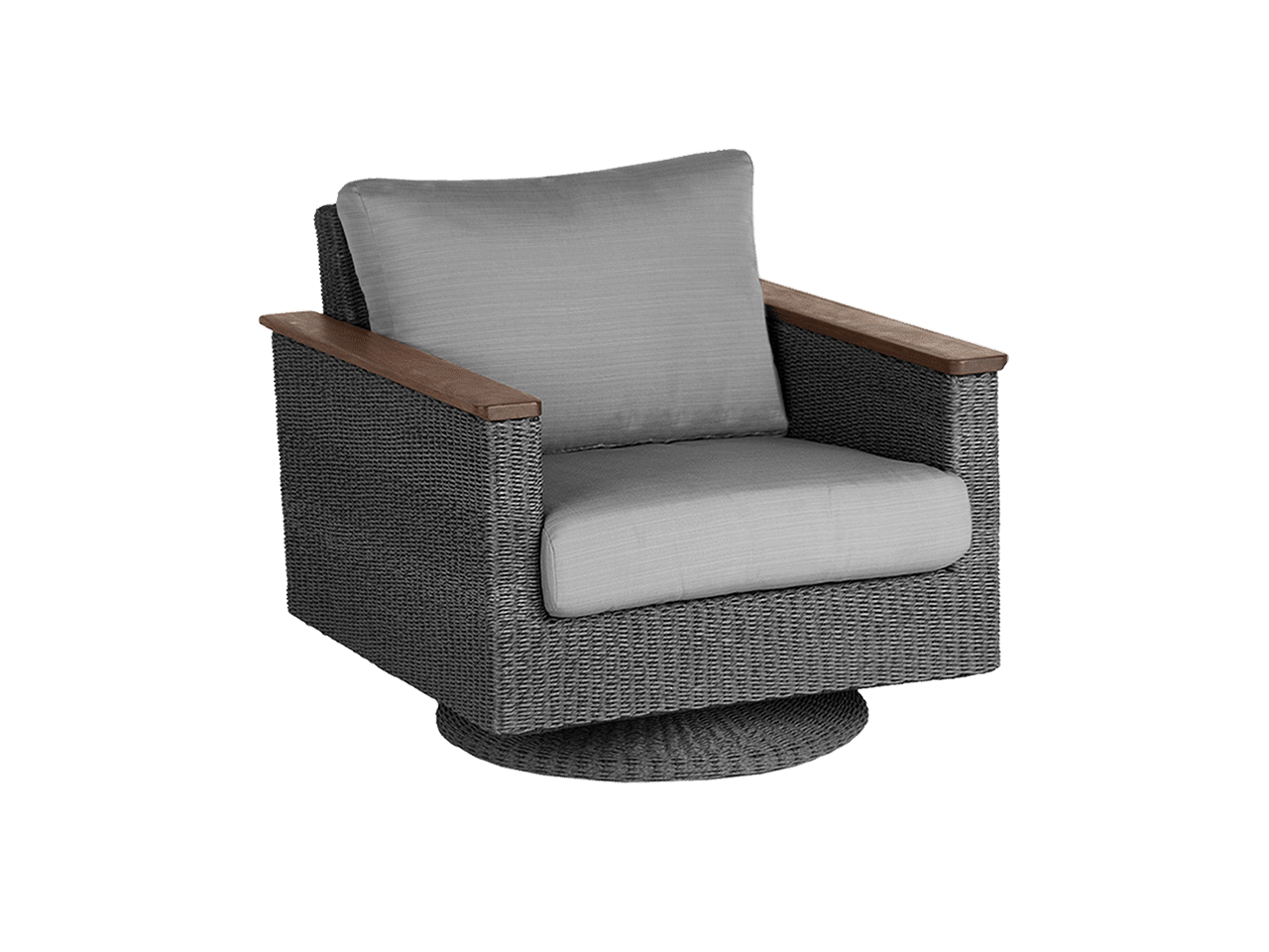 - Swivel rocker frame is crafted from environmentally-friendly Viro Fiber® material atop a commercial grade, powder coated aluminum frame with Ipe timber edging on armrests.