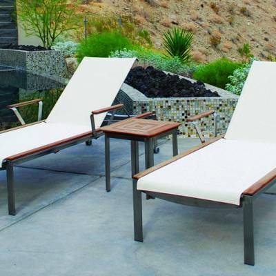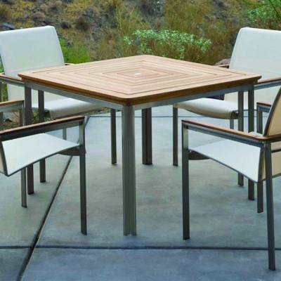 All pieces are crafted from the finest #304 stainless steel and premium teak. Complementary tables are constructed with heavy duty steel frames and spectacular teak wood tops.