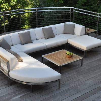 The sectional is comprised of seven individual units that can be arranged in endless configurations, such as an archetypal "L" shaped sectional; a rounded sectional for use with a fire pit; a sofa or settee; a circular daybed; or a tête-à-tête.