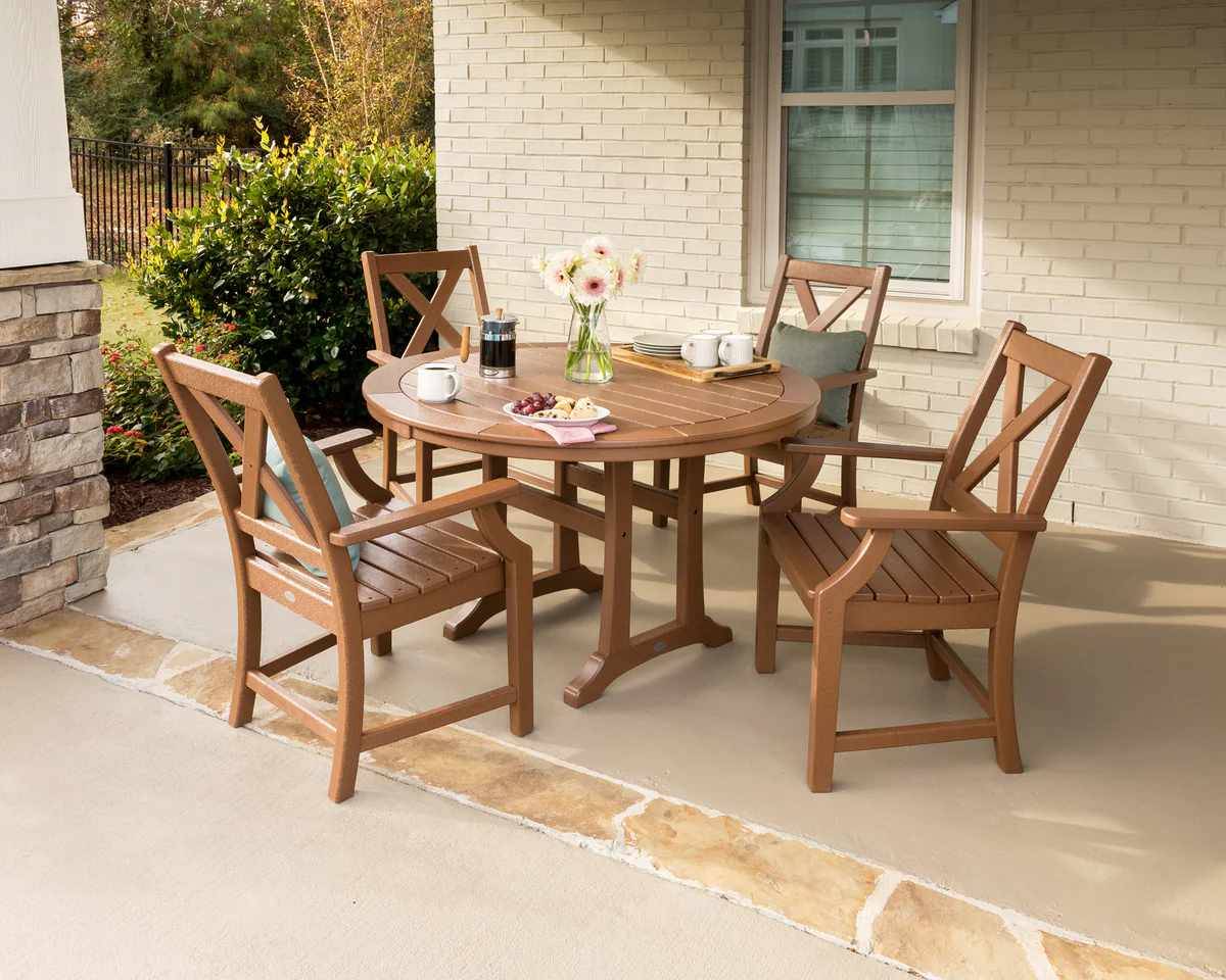 Have you imagined yourself enjoying a quiet outdoor breakfast with your family on a mild summer morning? It sounds lovely, doesn't it? With the Braxton 5-Piece Nautical Trestle Arm Chair Dining Set, everyone will have plenty of room to enjoy the birds chirping while indulging in some homemade blueberry waffles. Create a relaxing and stylish outdoor dining experience with the Braxton Dining Side Chair. BONUS: maple syrup is easy to clean off of POLYWOOD furniture — simply wipe away with a damp cloth.