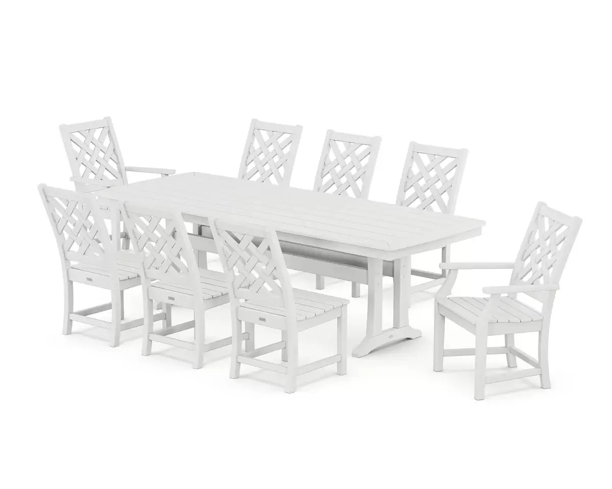 The nine-piece Wovendale dining set comes with two arm chairs and six side chairs around a spacious rectangular Nautical Trestle table.