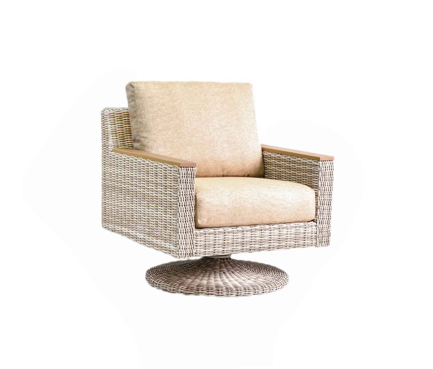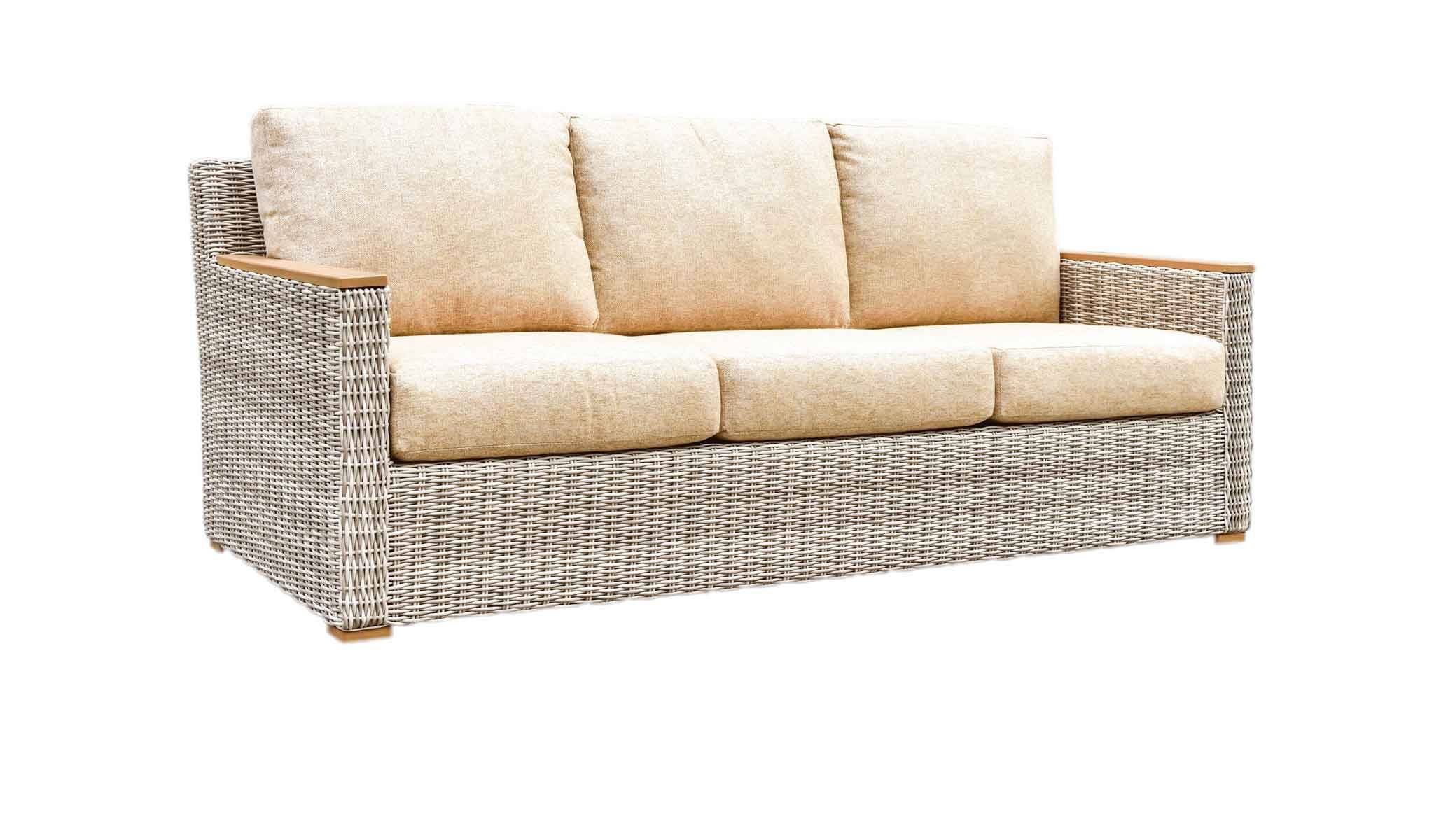 This casual contemporary woven collection is handcrafted with precision artistry offering modern appeal and ultimate comfort. This charming woven collection features teak accents on the arms as well as the feet. Basseterre highlights a charming blend of premium grade all weather wicker woven onto an all-aluminum powder coated frame and plush weather resistant cushions.