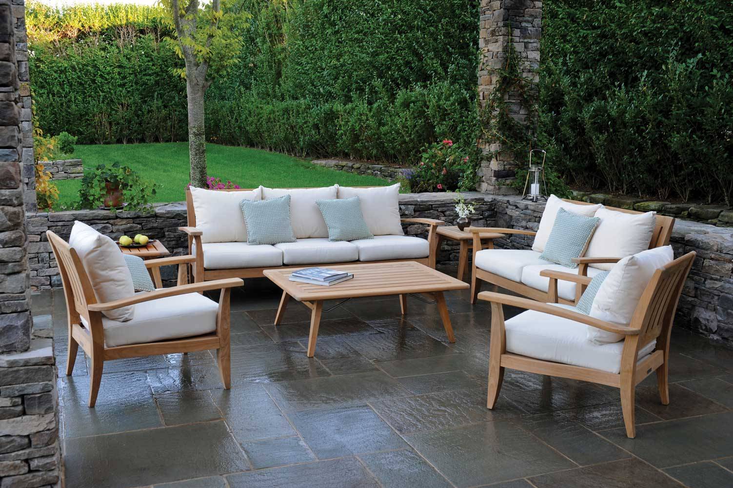 Available dining and deep seating pieces are constructed from solid teak; some items incorporate marine- grade, stainless steel braces that are both beautiful and functional.