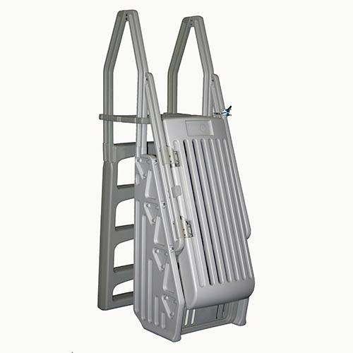 This entry system features a step on the outside of your pool for easy climbing and a ladder on the inside to minimize obstruction. It has a self-closing, self-latching & lockable gate for safety & to meet code requirements. It is adjustable from 48″ to 56″ with a 12″ top rail clearance. Available in both White and Taupe.