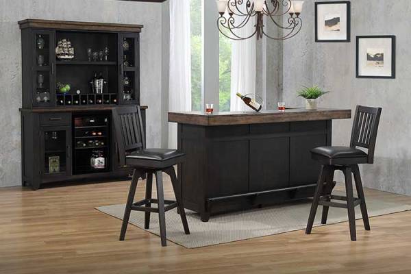 Solid hardwood Bar top in a stunning distressed finish. Includes 2 sliding doors, wine rack and large drawer.