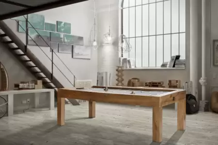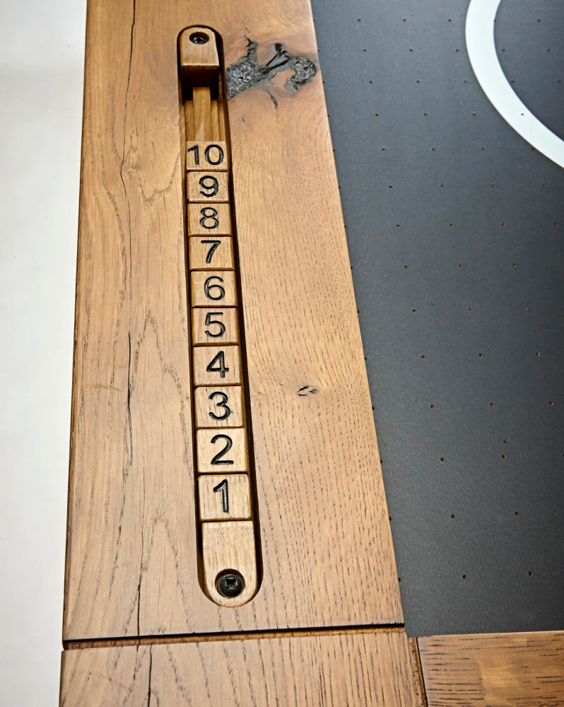 The Parsons Air Hockey Table showcases a sturdy, minimalist design with a natural dry oak finish, highlighting the exquisite hardwood knots and cracks that make each table truly one-of-a-kind.
