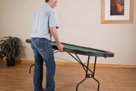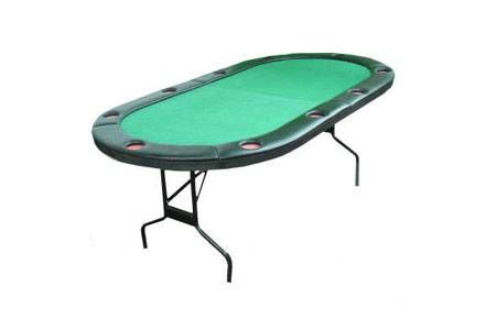 The green cloth playing surface is comfortable and level, and prevents chips and cards from unwanted shifting. The rail is cushioned for extra comfort, and also incorporates 10 built-in drink holders. The table's legs are collapsible, and the center of the table folds for easier storage. Overall, the table measures 83-1/2" long and provides plenty of surface area for any poker game.