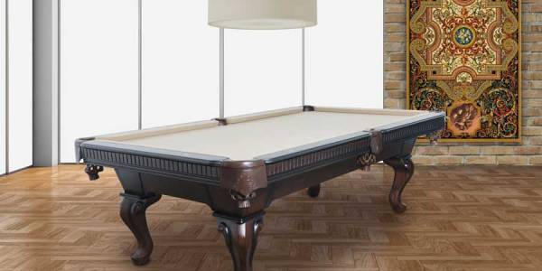 The Monroe is a classic billiard table crafted from African hardwood. It has a distressed Walnut finish with dark highlights. The two-tone finish on the Monroe hardwood billiard table accentuates the detailed ball and claw pool table leg carving.