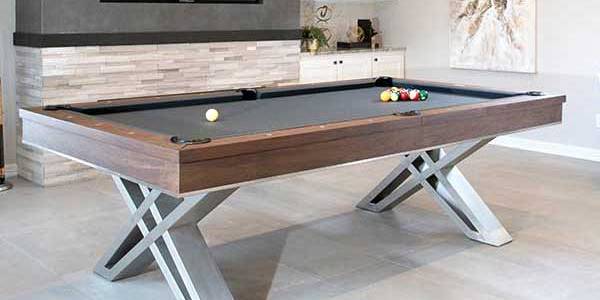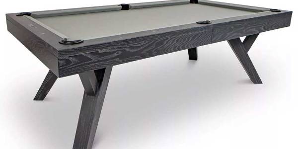 The Pierce is a modern pool table set off by bold stainless-steel legs and comes in a natural walnut finish.