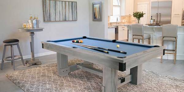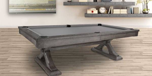 The Silverton rustic wood pool table is incredibly sturdy and comes with metal accents on the corners and stretchers. The Silverton is manufactured out of African Hardwood, and this pool table is built to withstand the demands of an active family. The unique barndoor gray finish creates a subtle, natural look.