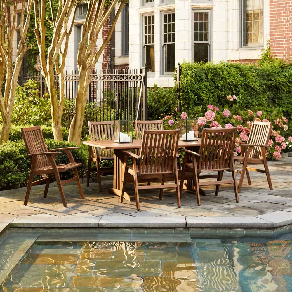 Welcome outdoor entertaining with open arms with the Franklin Dining Arm Chair from Jensen Outdoor. Fill your days with breezy brunches and your nights with backyard barbecues by pairing this stately chair with your favorite guests and any Ipe dining table. Settle in for leisurely meals and luxurious comfort with a supportive backrest, roomy seat and sculpted legs carved from individual slats of hardy Ipe timber.