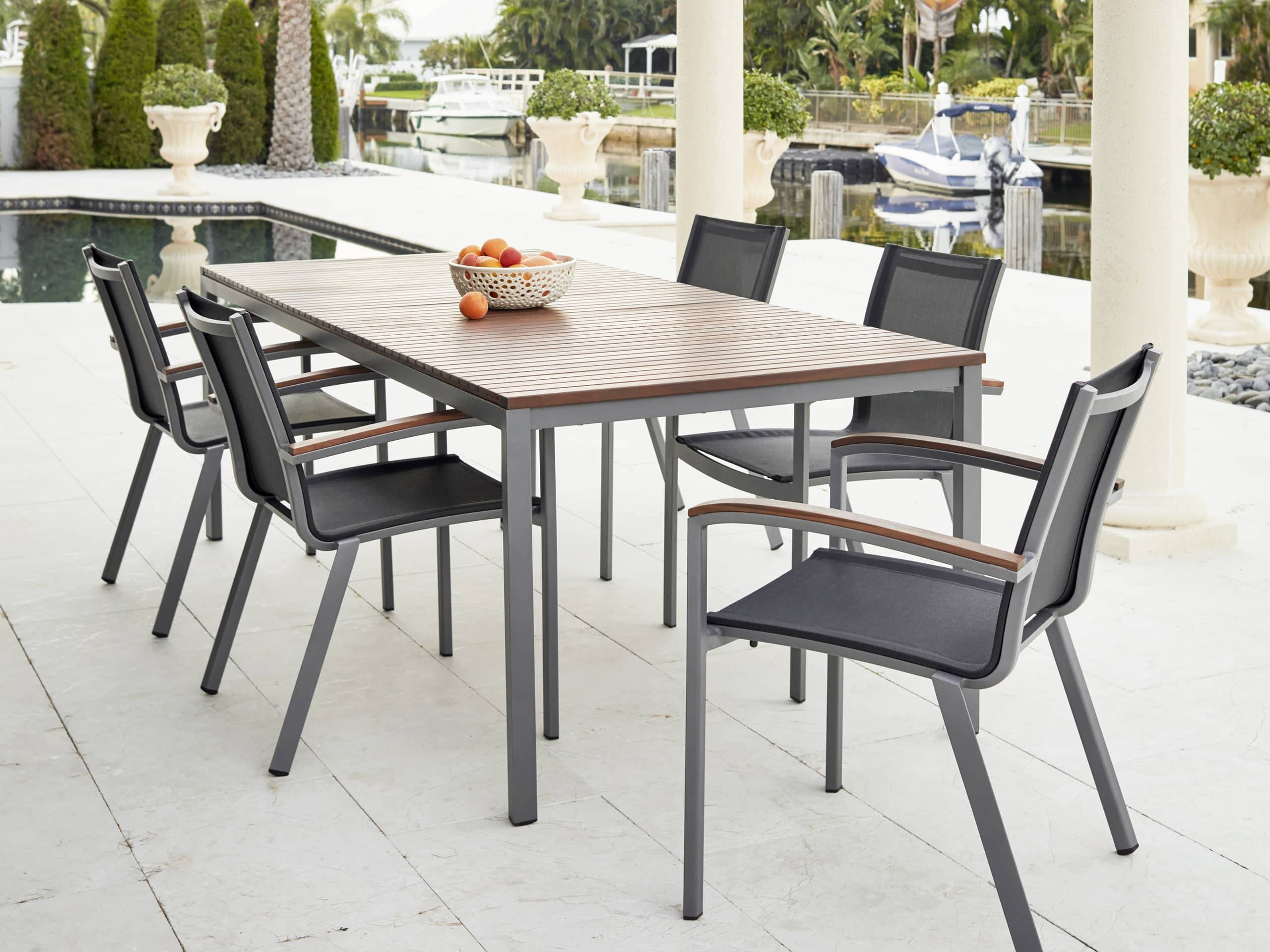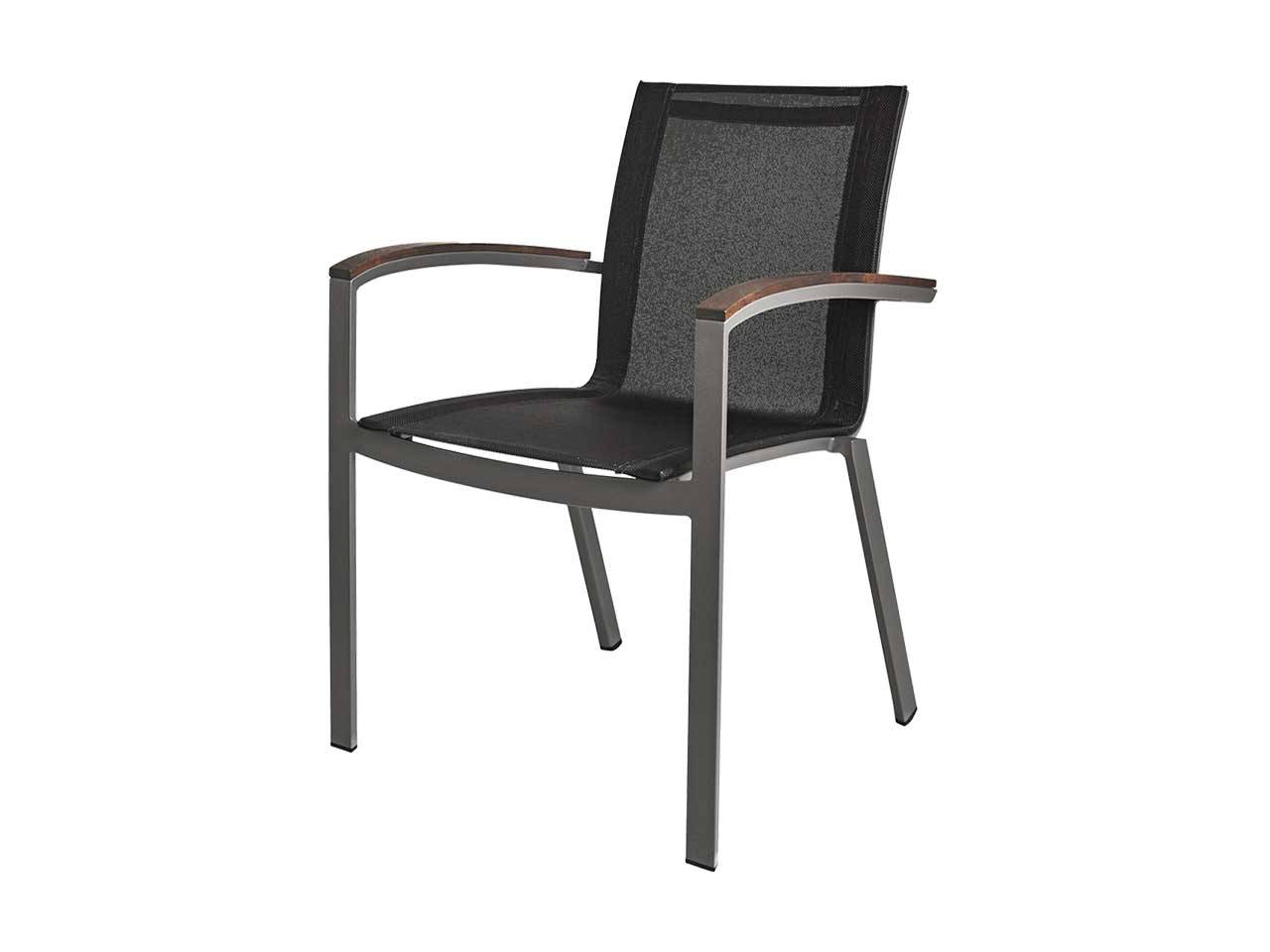 The Harmony Stacking Sling Arm Chair in gray commercial grade, powder-coated aluminum base is paired to color-matched sling with Ipe arms.