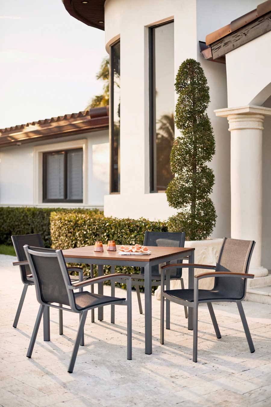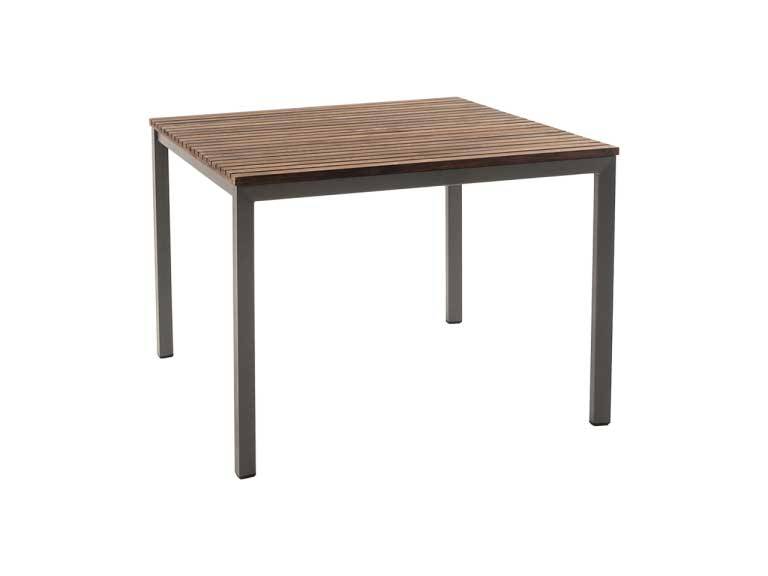 The Harmony 40″ Square Dining Table in gray commercial grade, powder-coated aluminum base with a durable Ipe top is perfect for four.