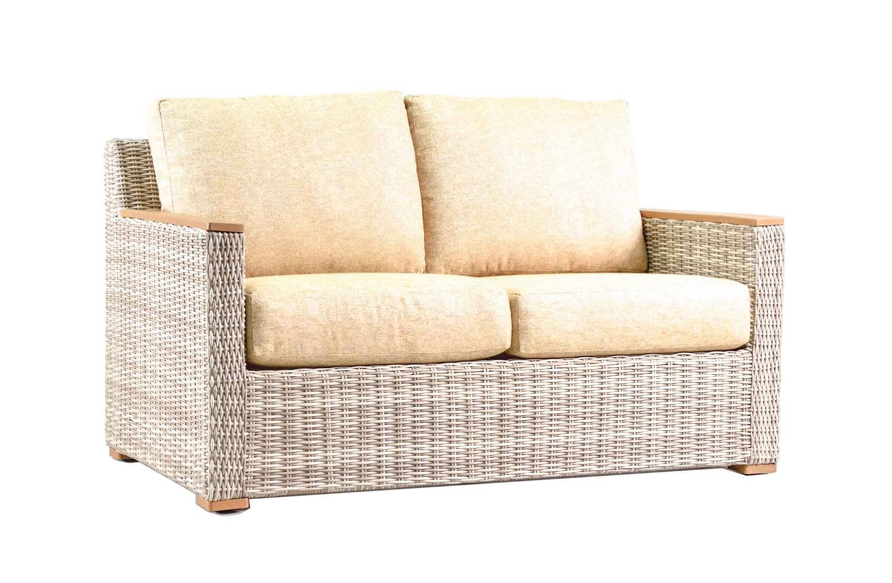 This casual contemporary woven collection is handcrafted with precision artistry offering modern appeal and ultimate comfort. This charming woven collection features teak accents on the arms as well as the feet. Basseterre highlights a charming blend of premium grade all weather wicker woven onto an all-aluminum powder coated frame and plush weather resistant cushions.