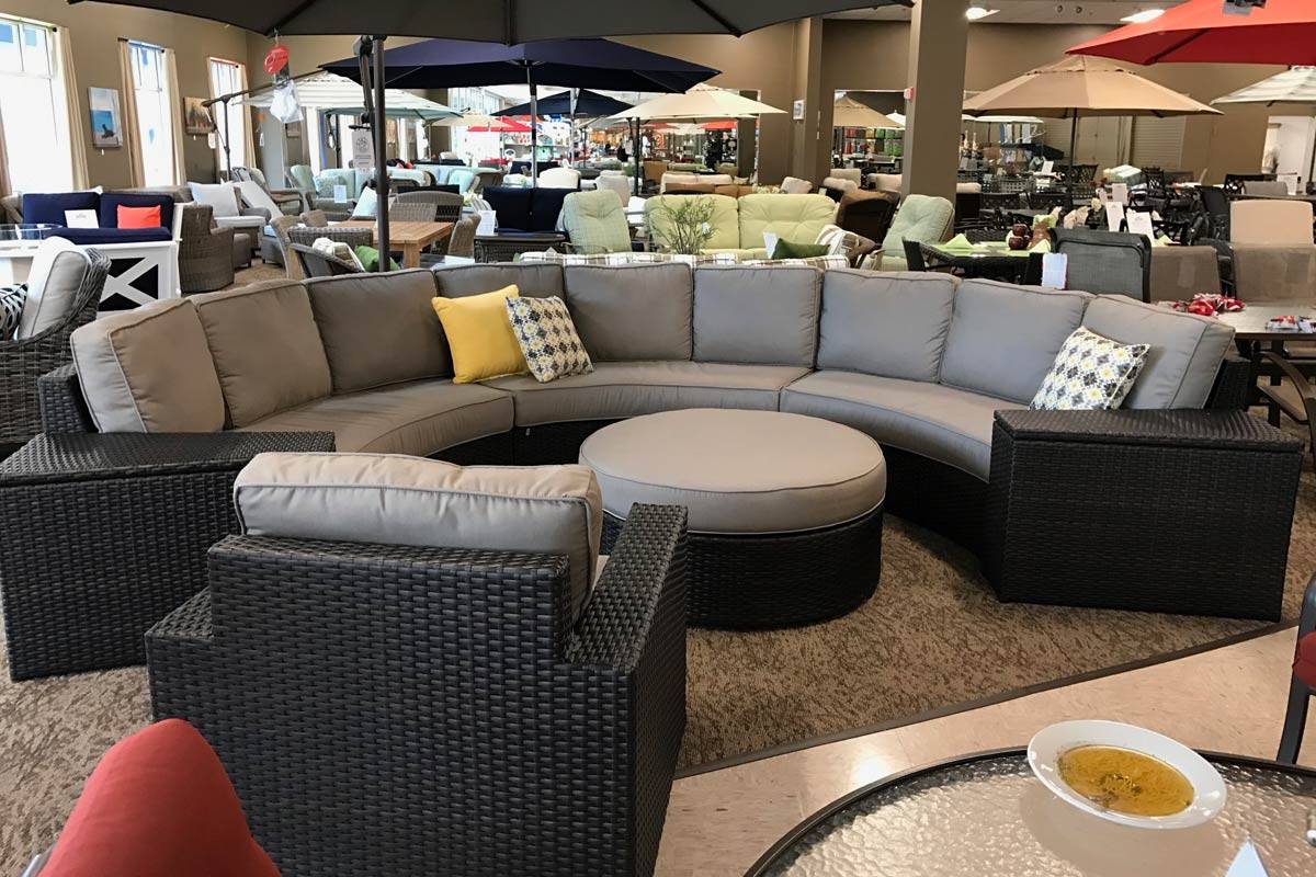 The Del Mar Curved Sofa Seating Collection offers deep seating and spacious wedged armrests with storage. This collection is designed with premium and comfortable deep seating with a durable resin weave over a sturdy commercial grade aluminum frame. The Del Mar collection is available in a rich Godiva flat weave and the plush cushions are of weather-resistant Sunbrella fabric.