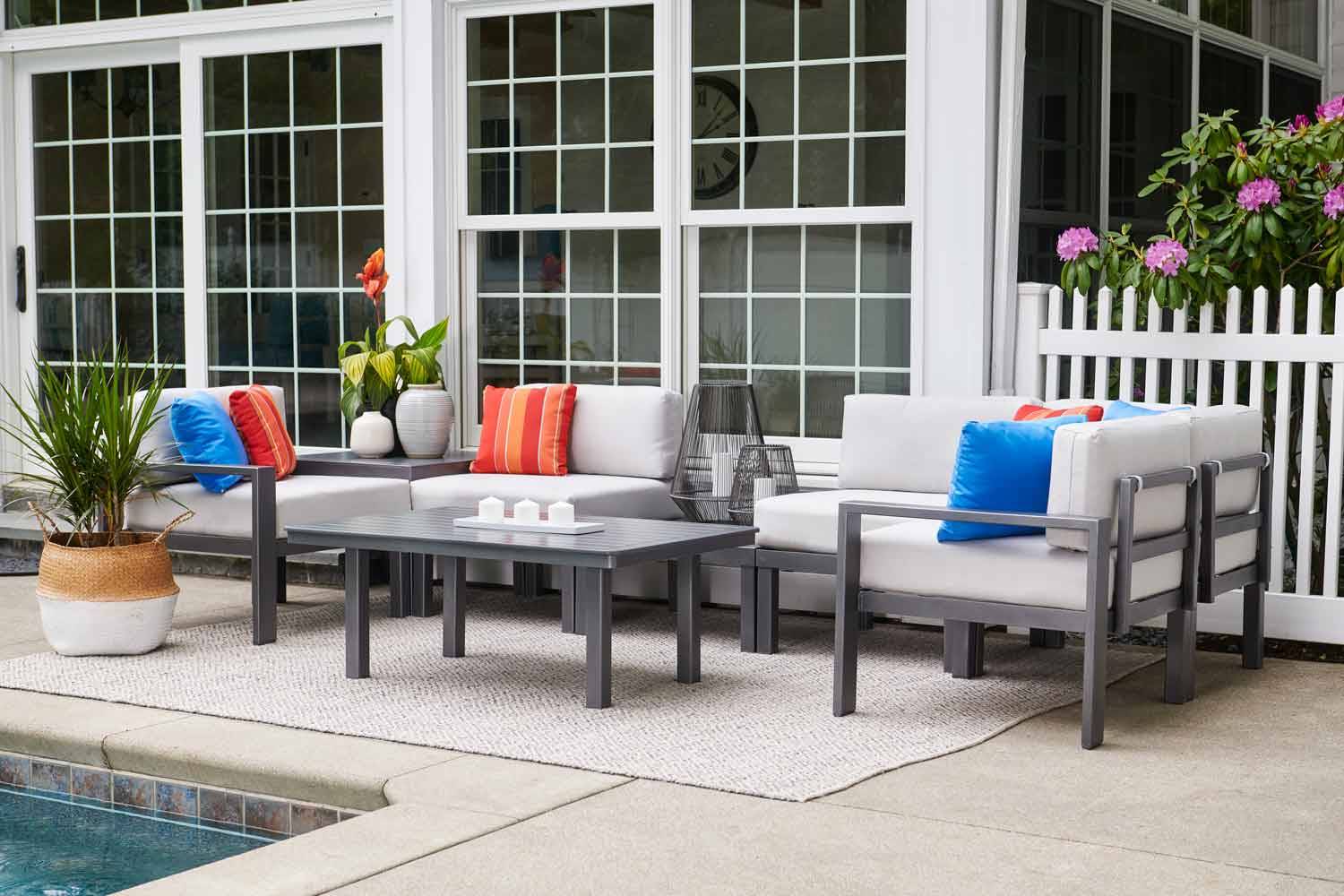 - Stocked in Kona frame and Sunbrella Grasscloth Dune cushion fabric